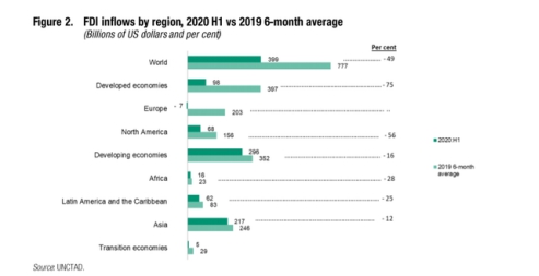 10月27日,联合国贸发会议发布最新一期《全球投资趋势监测报告》。报告指出,鉴于2020年上半年全球外国直接投资(FDI)大幅下降,尤其是欧美发达经济体外国直接投资骤降,报告对全球外国直接投资前景的预测趋于负面,预计全年外国直接投资将下降30%至40%。但中国及东南亚国家的外国直接投资相较其他地区更具韧性,总体趋于稳定。