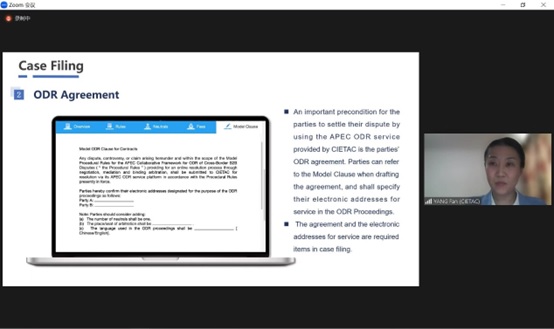 贸仲网上争议解决中心秘书长杨帆代表贸仲在研讨会上作了专题发言,介绍贸仲在ODR方面的探索和实践,并从基础建设、用户支持、ODR程序启动和进行、程序正当性保障、智能特色和网络安全等六个方面重点展示贸仲为实施APEC ODR机制所提供的ODR服务和平台。
