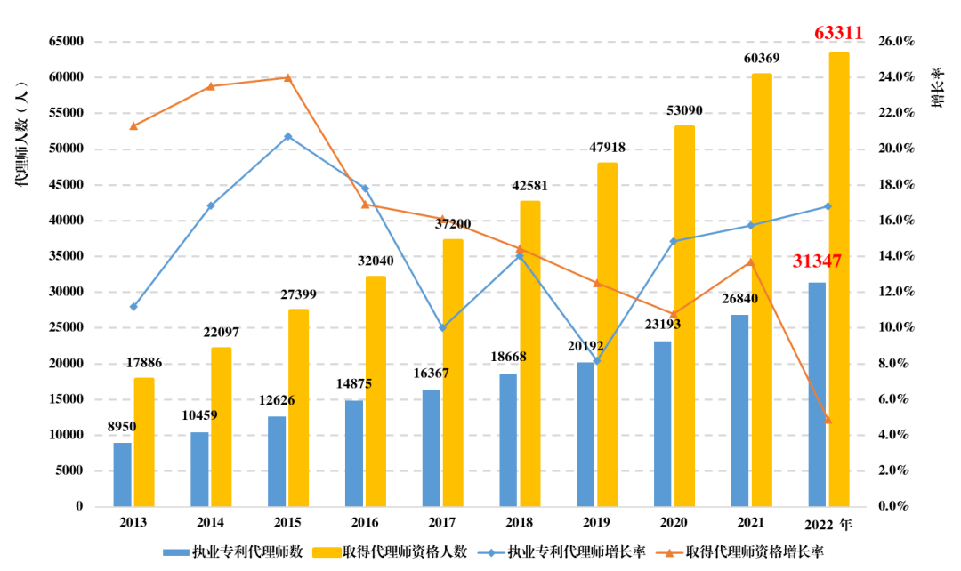 随着我国专利申请量和专利代理业务需求的增长,专利代理人才队伍不断壮大,截至2022年底,我国执业专利代理师已达到31347人。