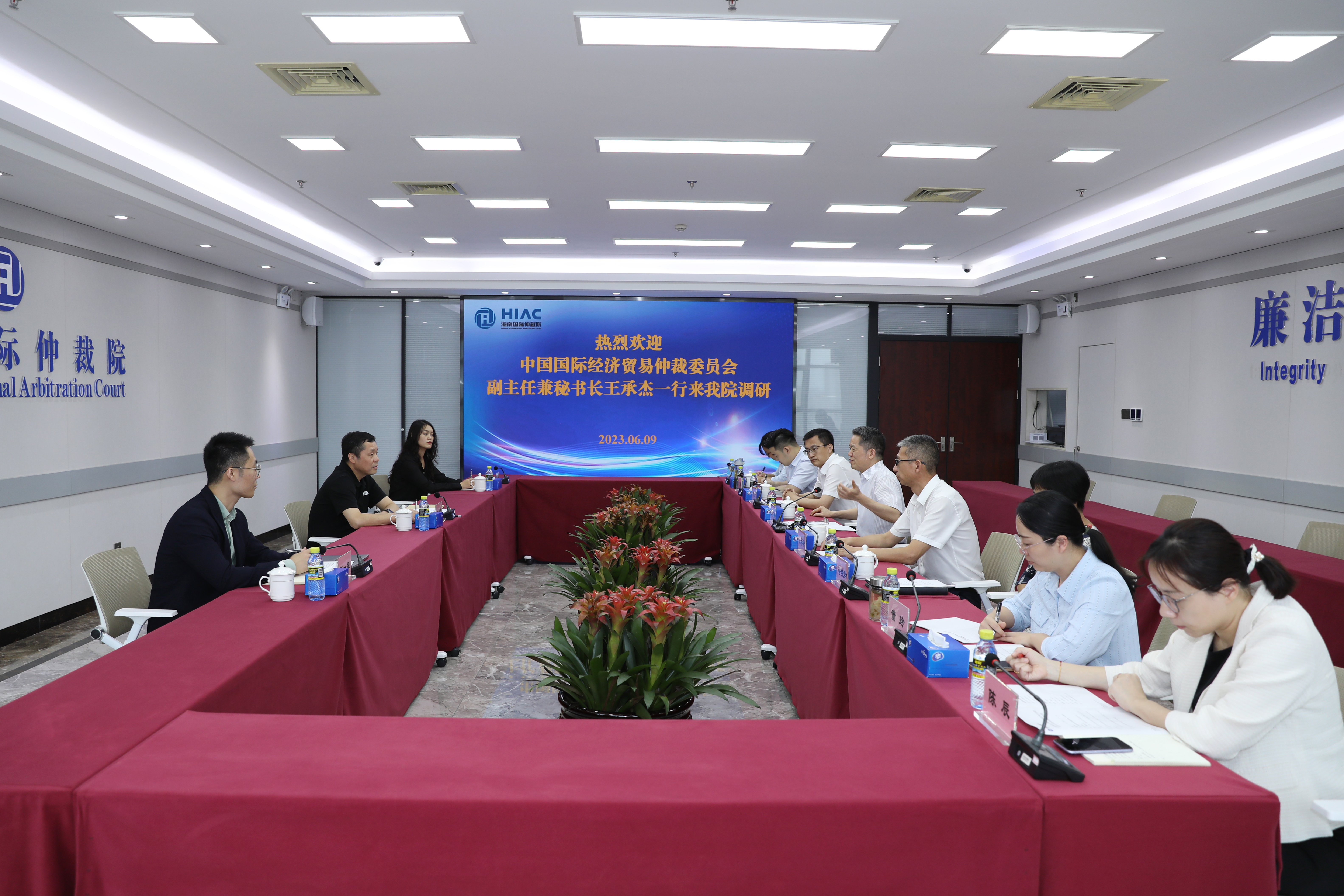 2023年6月9日下午,中国国际经济贸易仲裁委员会(以下简称“贸仲”)副主任兼秘书长王承杰一行赴海南国际仲裁院(简称“海国仲”)走访并座谈。