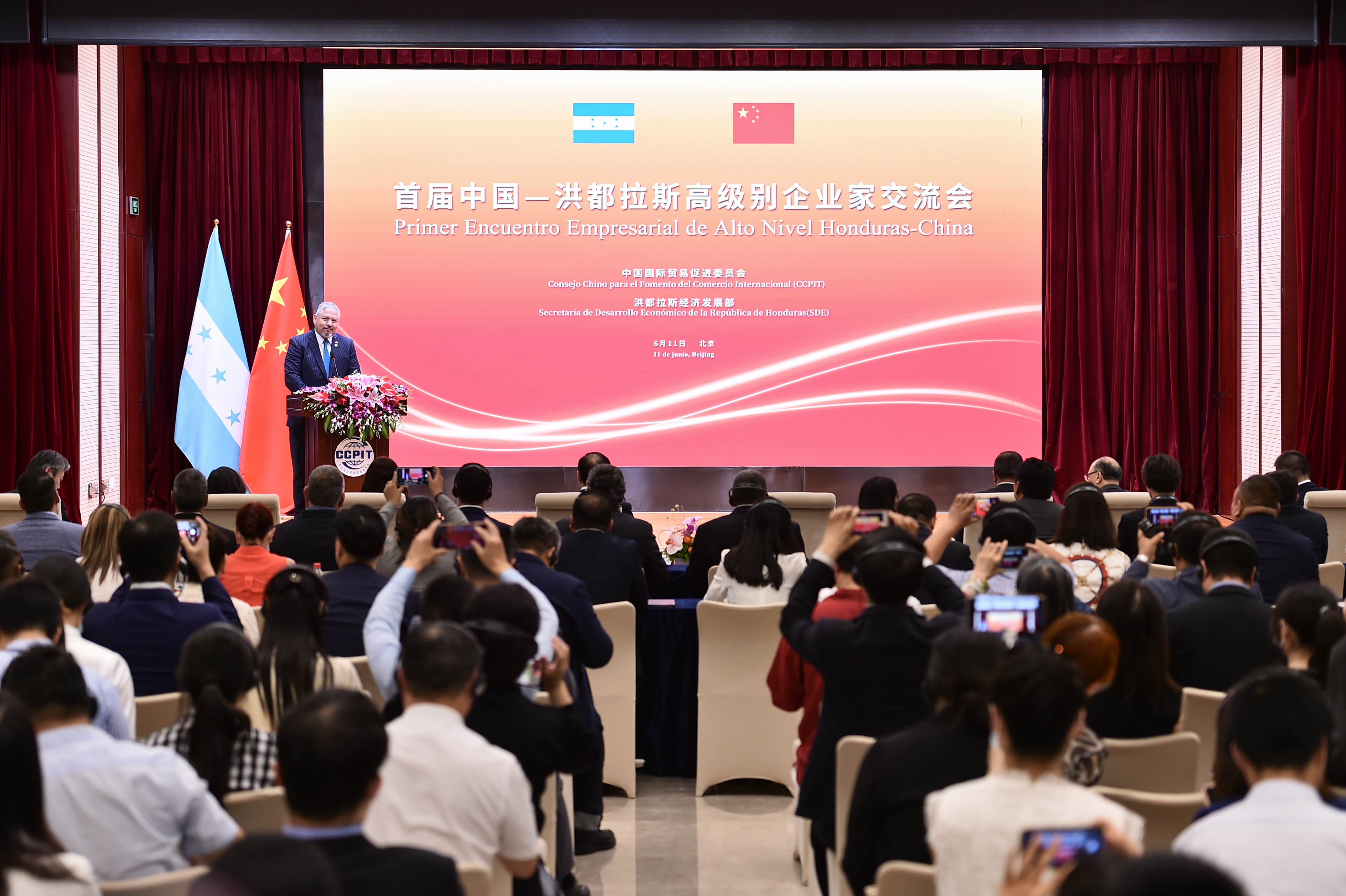 6月11日下午,首届中国—洪都拉斯高级别企业家交流会在京成功举办。 副会长张少刚和洪都拉斯外长雷纳、经济发展部部长塞拉托、农业及畜牧业部部长苏阿索、经济发展部副部长雷东多出席交流会,中国国际商会秘书长孙晓主持会议。