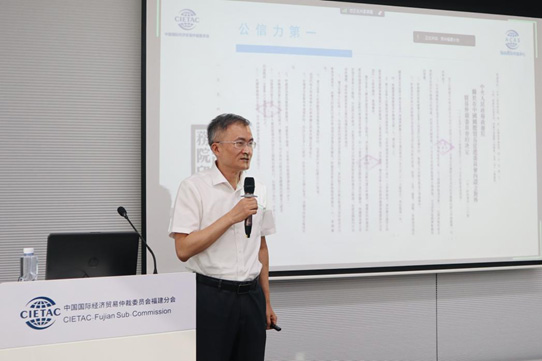 演讲环节中,贸仲福建分会秘书长、海峡中心副秘书长陈朝晖作题为“涉外商事争议的仲裁解决方案---从执行视角分析”的演讲。他表示,仲裁是国际公认的涉外商事争议化解的首选方式,具有当事人意思自治、一裁终局、跨境执行便利等优势。贸仲是全球最受欢迎的五大仲裁机构之一,也是中国仲裁的开拓者、引领者和示范者。海峡中心是唯一主要化解两岸经贸争议的国家级仲裁机构。贸仲和海峡中心是中国仲裁的国家队,在处理跨区域争议时具有天然优势。他还结合仲裁裁决在域外执行的经典案例剖析了《纽约公约》第五条和第七条。他强调应高度关注仲裁条款,重视诚信原则在仲裁中的重要地位、认真处理好每个程序环节。