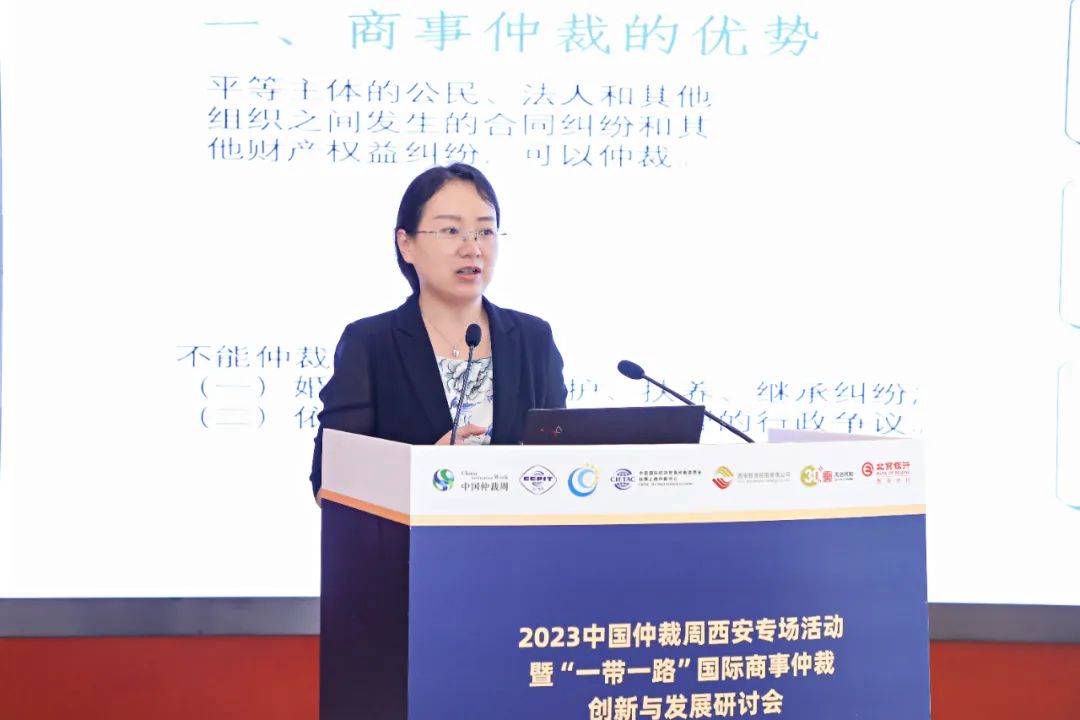 蒋红梅女士在致辞中介绍了贸仲的仲裁业务数据及国际化服务优势。她表示,西安站在向西开放的前沿,是服务构建新发展格局、推动更高水平对外开放的重要力量。期待通过本次研讨会,大力宣传仲裁法律制度、深化落实合作机制,发挥贸仲国际品牌优势,共同提升企业的涉外法律风险防范水平及争议解决能力,为“一带一路”对外经济贸易发展保驾护航。