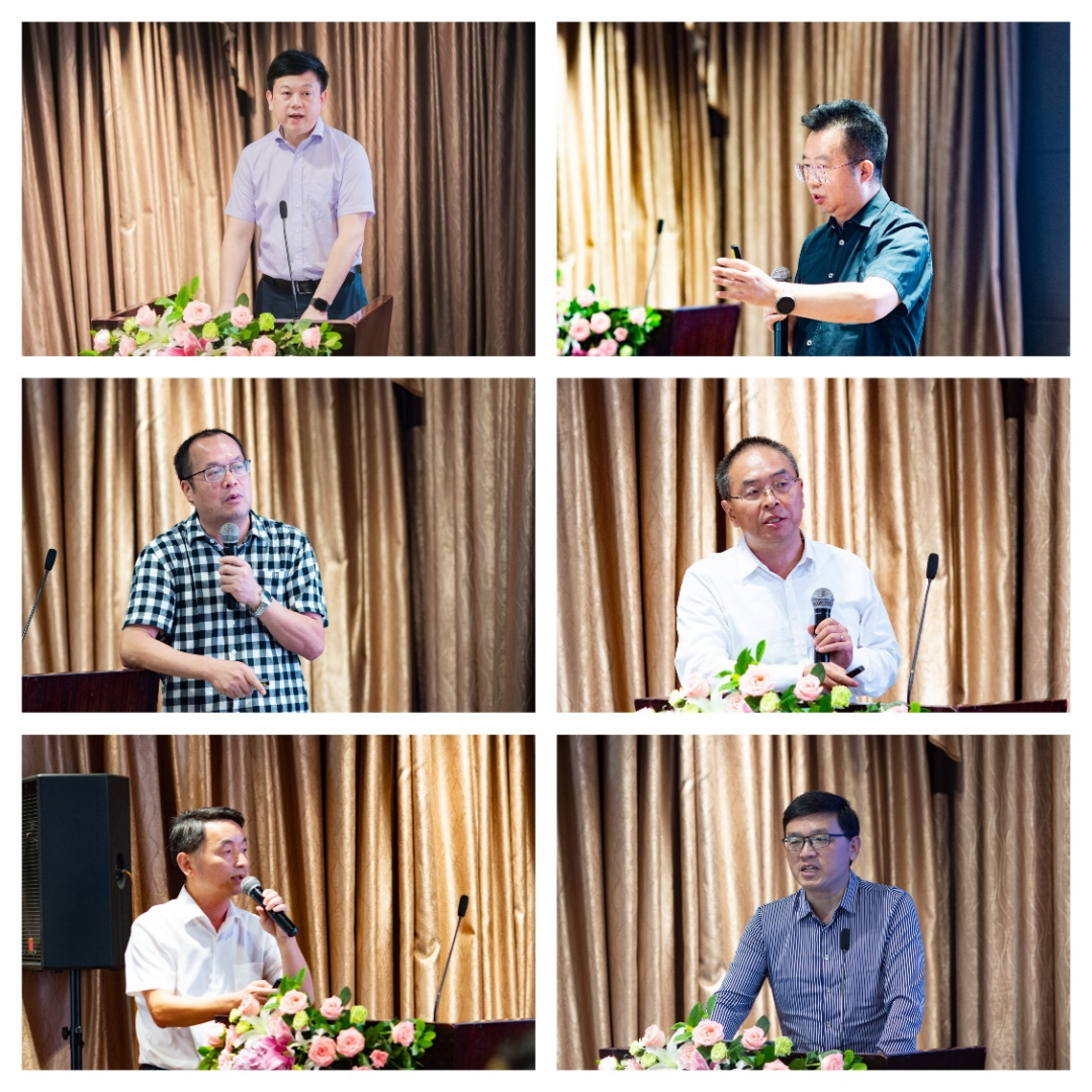 (主题演讲环节,左上为主持人杨红兵部长、右上为刘大洪教授、左中为刘穷志教授、右中为管斌主任、左下为华文彬总法律顾问,右下为王进力副总经理)