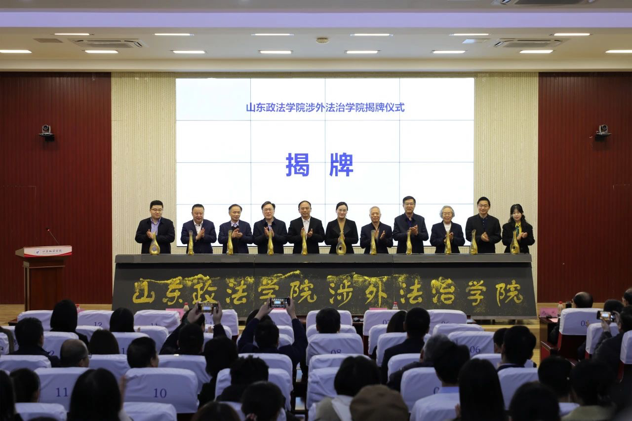 2023年11月10日上午,山东政法学院举行涉外法治学院揭牌仪式暨涉外法治人才培养座谈会。中国国际经济贸易仲裁委员会山东分会(以下简称“贸仲山东分会”)秘书长助理周玥熠与山东省教育招生考试院院长李霞、山东省司法厅二级巡视员王强、山东省商务厅二级巡视员夏炳军、中国人民大学法学院教授赵秀文、中南财经政法大学法学院副院长、教授江河、山东省高级人民法院民四庭庭长张传毅、山东省律师协会会长耿国玉、自贸试验区济南片区管委会副主任陈浩、山东政法学院党委书记张祥云、校长吕涛共同为山东政法学院涉外法治学院揭牌。