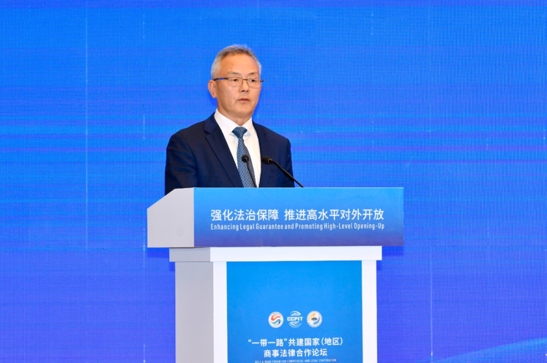 11月16日,“一带一路”共建国家(地区)商事法律合作论坛在西安成功举办。 党组成员李庆霜、陕西省人民政府副省长戴彬彬出席活动并致辞,最高人民法院第六巡回法庭分党组副书记、副庭长、一级高级法官罗智勇,土耳其驻华大使馆首席商务参赞阿塔坎·奥兹德米尔,乌兹别克斯坦总统直属立法和法律政策研究所所长学术秘书拉苏列夫·阿卜杜勒阿齐兹·卡里莫维奇,中国政法大学中欧法学院欧方执行院长罗纳德·蒙塔古·西里, 法律事务部副部长、国际商事争端预防与解决组织秘书长沈佩兰现场出席,亚洲国际仲裁中心主席、亚洲多元争议解决研究院主席拿督桑德拉·拉铢,英国国王枢密院御用大律师威廉·高德温线上参会。陕西省贸促会会长贾正兰主持。