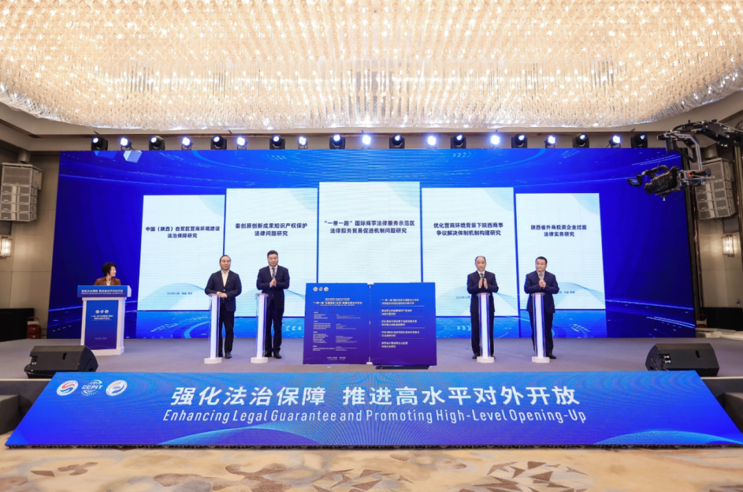 在成果发布环节,陕西省贸促会党组书记王运林、西北政法大学国际法学院院长刘亚军、西安交通大学法学院副院长李万强、北京市炜衡(西安)律师事务所主任王小涛共同发布《“一带一路”国际商事法律服务示范区法律服务贸易促进机制问题研究》、《秦创原创新成果知识产权保护法律问题研究》、《优化营商环境背景下陕西商事争议解决体制机制构建研究》、《中国(陕西)自贸试验区营商环境建设法治保障研究》、《陕西省外商投资企业过渡法律实务研究》等5项课题研究成果。
