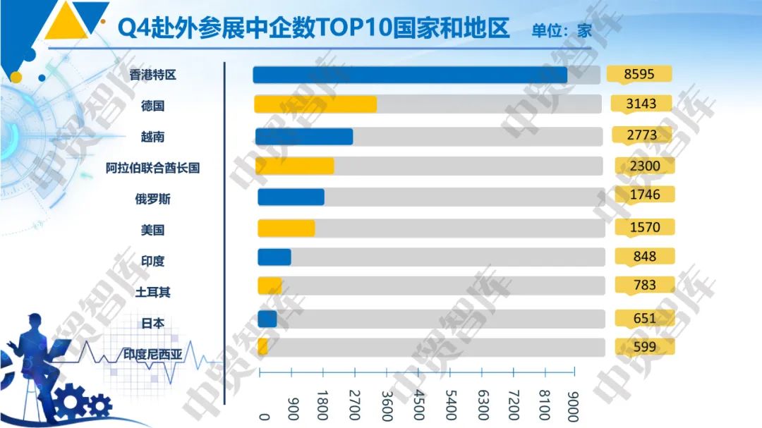 4.共建“一带一路”国家展览对中企吸引力逐步加大。Q4中企赴外参展数Top10 国家和地区分别是香港特区(8595家)、德国(3143家)、越南(2773家)、阿拉伯联合酋长国(2300家)、俄罗斯(1746家)、美国(1570家)、印度(848家)、土耳其(783家)、日本(651家)、印度尼西亚(599家)。在TOP10国家或地区中,越南、阿联酋、俄罗斯、印度、土耳其、印度尼西亚等均为“一带一路”共建国家。赴上述6个国家的中企展商数量占TOP10展商总数的比例为39.33%,占总样本展商数的比例为36.33%。