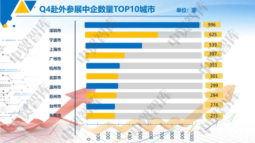 TOP10城市分别是深圳市(996家)、宁波市(625家)、上海市(539家)、广州市(397家)、杭州市(351家)、北京市(301家)、温州市(299家)、苏州市(284家)、台州市(274家)、东莞市(271家)。总体来看,这些城市赴外参展展商数量占抽样展商总数的17.41%。