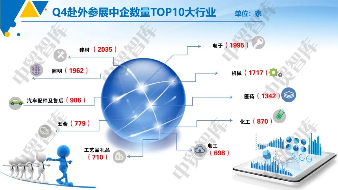 2.我国出口优势产业参展表现优异。这可以从Q4赴外参展中企数量TOP10大行业情况一窥究竟。这十大行业分别为建材(2035家)、电子(1995家)、照明(1962家)、机械(1717家)、医药(1342家)、汽车配件及售后(906家)、化工(870家)、五金(779家)、工艺品礼品(710家)、电工(698家),其展商数量占总样本展商数比例达到52.24%。此外,我们还统计出Q4赴外参展中企数量TOP10的小行业,分别为其他电子(1146家),其他照明(901家),医疗设备(543家),塑料(404家),建筑玻璃(356家),专用灯具(339家),风机、排风设备(337家),室内灯饰照明灯具(307家),家用电器(300家),其他工艺品礼品(279家)。