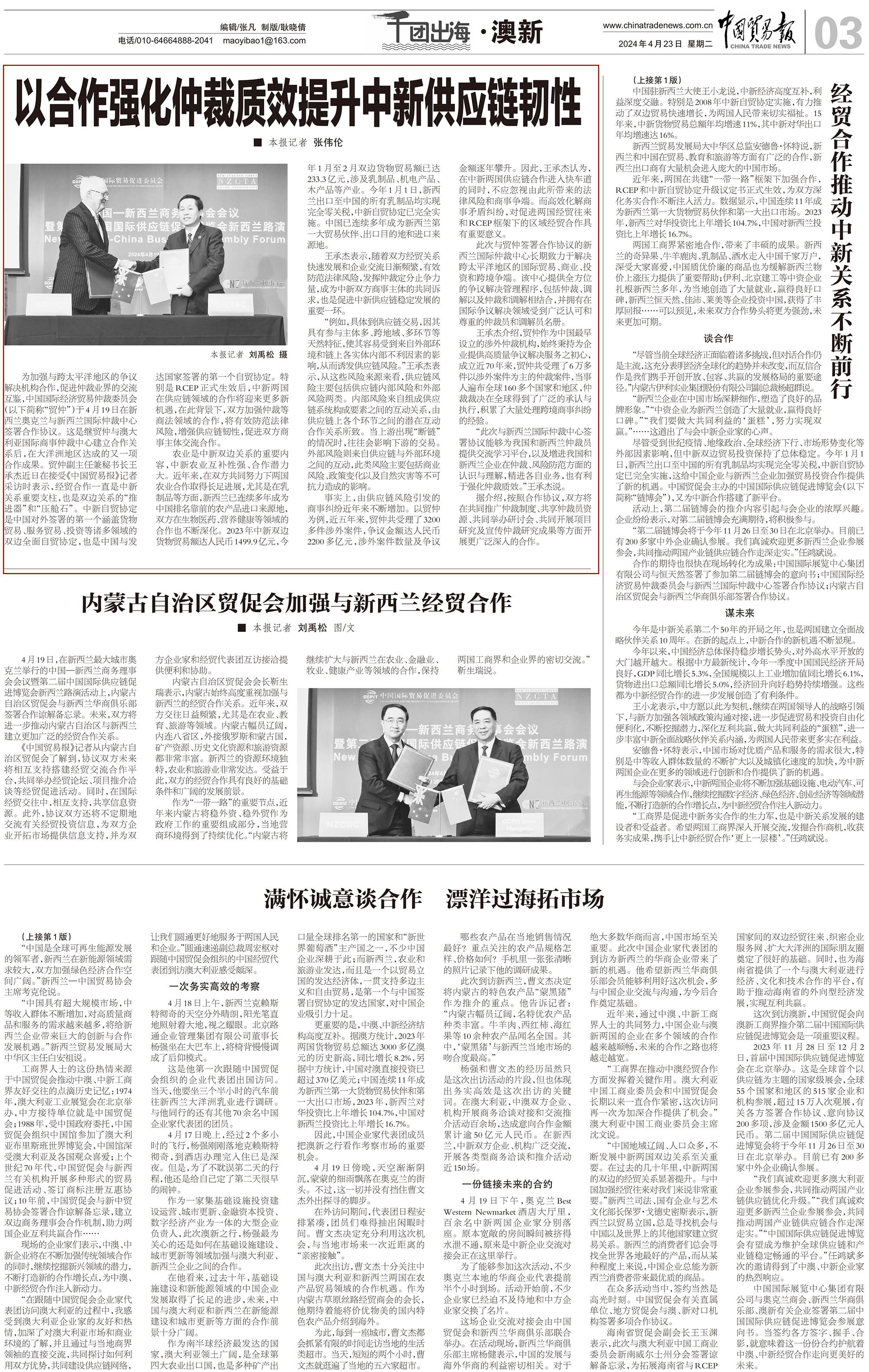 为加强与跨太平洋地区的争议解决机构合作,促进仲裁业界的交流互鉴,中国国际经济贸易仲裁委员会(以下简称“贸仲”)于4月19日在新西兰奥克兰与新西兰国际仲裁中心签署合作协议。这是继贸仲与澳大利亚国际商事仲裁中心建立合作关系后,在大洋洲地区达成的又一项合作成果。贸仲副主任兼秘书长王承杰近日在接受《中国贸易报》记者采访时表示,经贸合作一直是中新关系重要支柱,也是双边关系的“推进器”和“压舱石”。中新自贸协定是中国对外签署的第一个涵盖货物贸易、服务贸易、投资等诸多领域的双边全面自贸协定,也是中国与发达国家签署的第一个自贸协定。特别是RCEP正式生效后,中新两国在供应链领域的合作将迎来更多新机遇,在此背景下,双方加强仲裁等商法领域的合作,将有效防范法律风险,增强供应链韧性,促进双方商事主体交流合作。