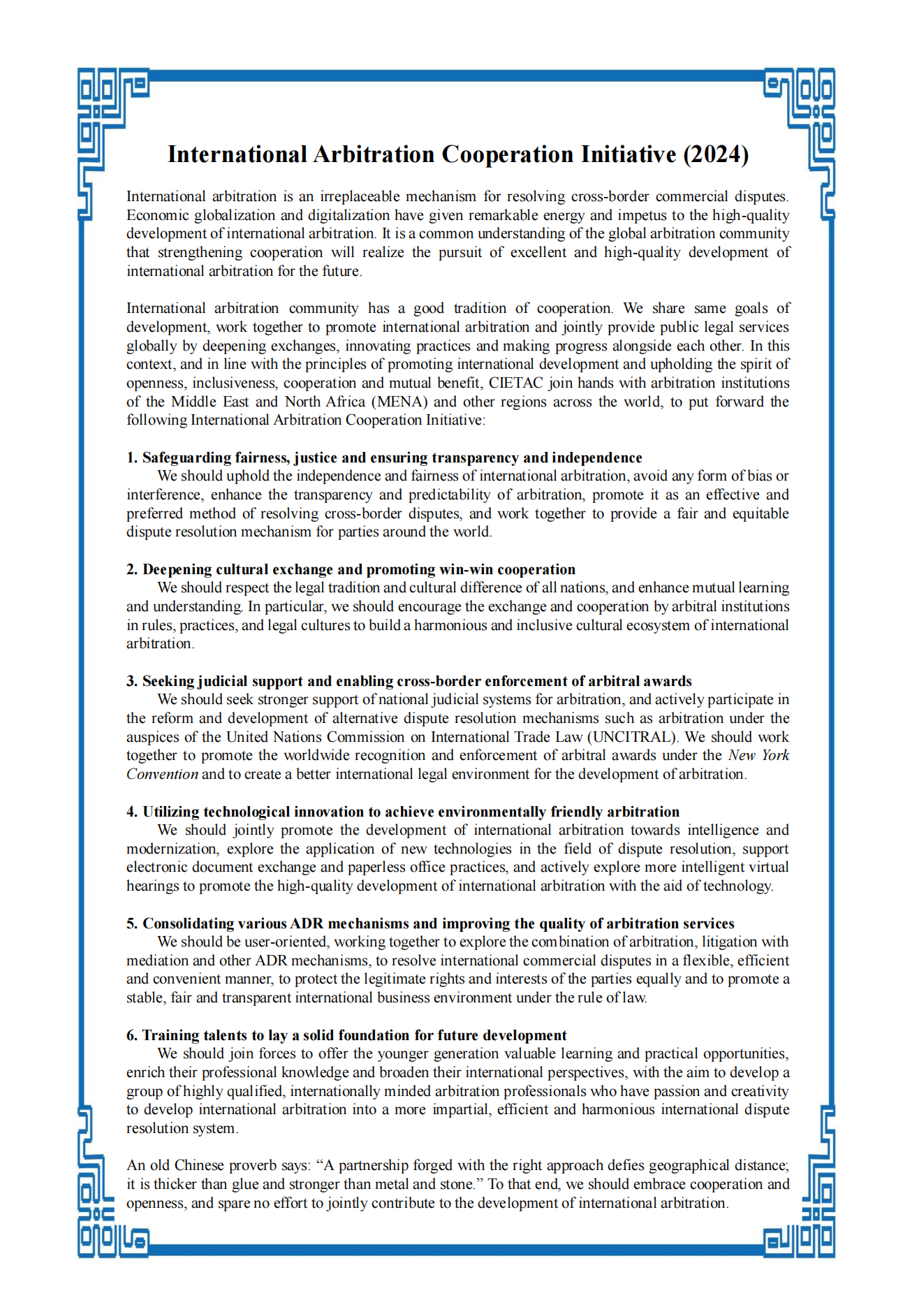在9月26日举行的2024中国仲裁高峰论坛暨中国-中东北非仲裁高峰论坛(“高峰论坛”)上,中国国际经济贸易仲裁委员会(“贸仲”)正式发布了以加强国际仲裁法治合作为目标的重要成果——《2024国际仲裁合作倡议》。
