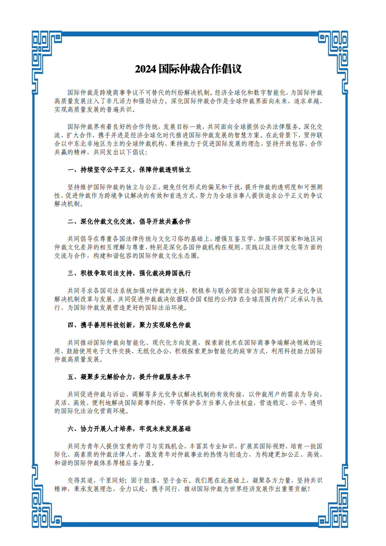 截至目前,《倡议》共获得了30家以来自中东北非地区为主的国际仲裁机构的支持与响应。未来,贸仲将与各方一道,以《倡议》为指引,持续发挥国际仲裁的重要作用,促进法治交流蓬勃开展,共同谱写国际仲裁合作新篇章。
