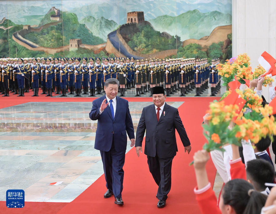 11月9日下午,国家主席习近平在北京人民大会堂同来华进行国事访问的印度尼西亚总统普拉博沃举行会谈。这是会谈前,习近平在人民大会堂北大厅为普拉博沃举行欢迎仪式。新华社记者 高洁 摄