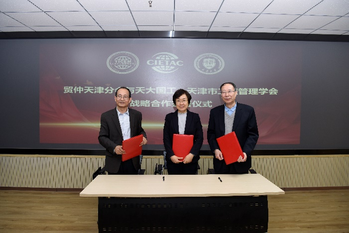 贸仲天津分会秘书长周雯,天津大学国际工程管理学院院长、贸仲仲裁员张水波,天津市工程管理学会理事长吕文学分别代表三方现场签署《战略合作协议》。