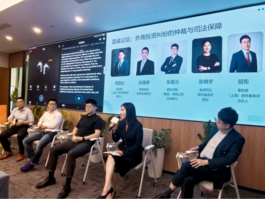 在主题为《外商投资纠纷的仲裁与司法保障》的圆桌讨论中,泰和泰(上海)律师事务所合伙人周显达担任主持人,网易游戏资深法律顾问孙逸琅、惠生控股(集团)有限公司法律顾问张晨光、金诚同达律师事务所顾问张晓宇、泰和泰(上海)律师事务所合伙人胡宪作为与谈人,分别分享了各自的观点并进行了深入的讨论,帮助与会嘉宾就如何通过仲裁和司法手段保障解决外商投资纠纷有了更深入的认识。在现场问答环节,圆桌嘉宾与其他参会嘉宾就商事仲裁的优势、中国法院对仲裁的司法监督和保障等问题进行了深入交流。