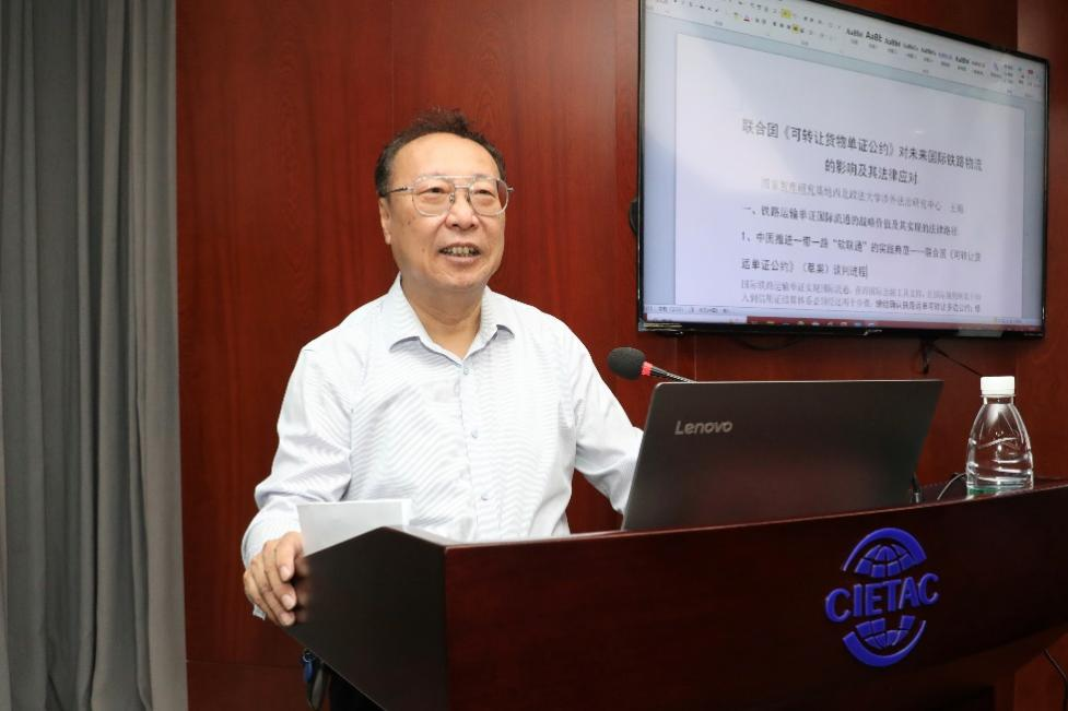 在主旨演讲环节,最高人民法院国际商事专家委员会委员、贸仲仲裁员、国家智库研究基地西北政法大学涉外法治研究中心执行主任、首席专家、中国低空经济法治研究院院长王瀚教授以“联合国《可转让货物单证公约》对未来国际铁路物流的影响及其法律应对”为题,系统介绍了公约的产生背景、核心要义及其生效后对全球贸易产生的重大影响,对企业可能面临的法律风险进行阐述并提出规避提示,为物流企业开展跨境业务提供前沿指导。