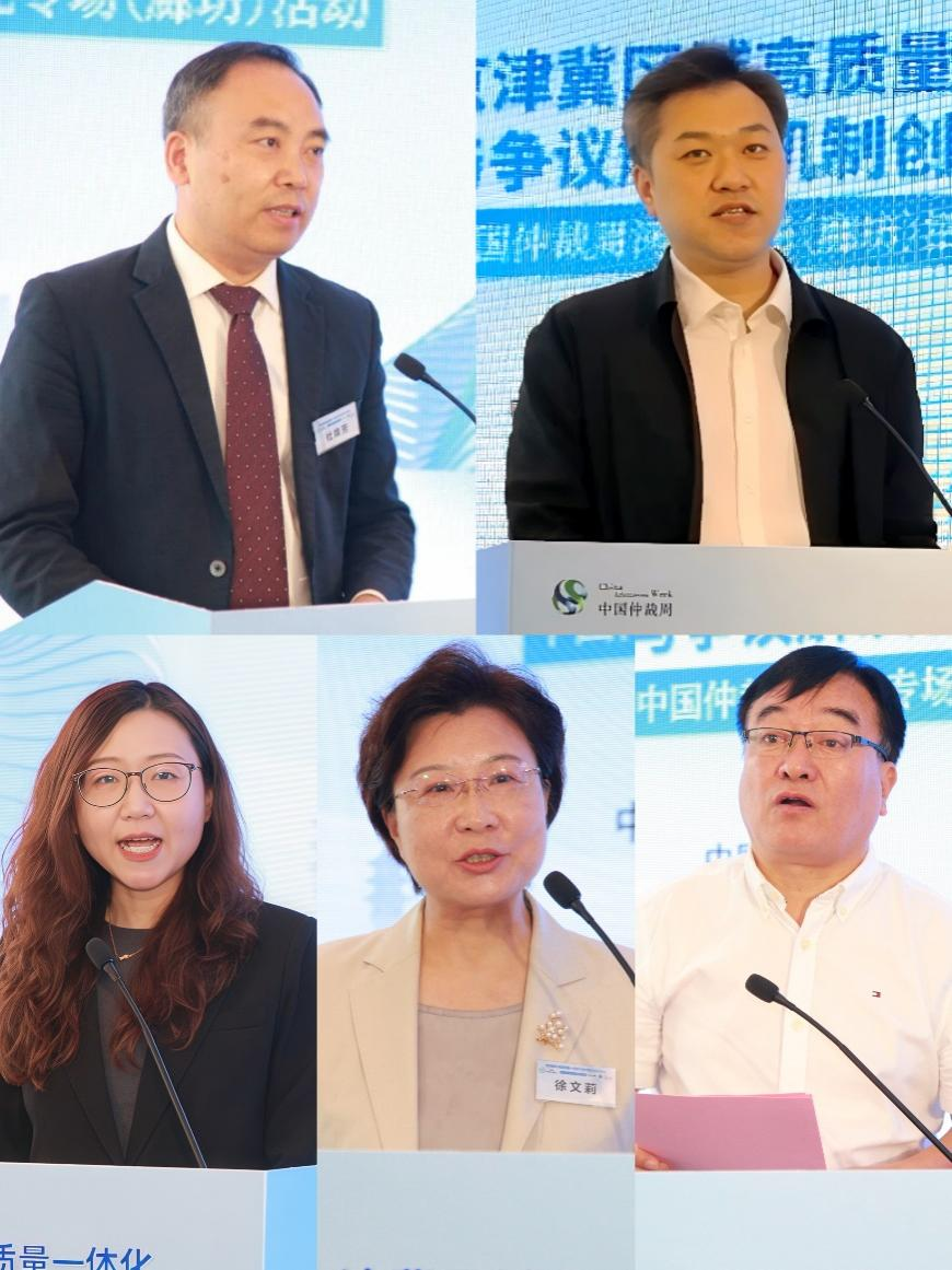 (从左至右,从上至下依次为:中国人民大学涉外法治研究院院长、廊仲第三届委员会副主任杜焕芳,河北省司法厅公共法律服务管理处处长张翼,贸仲立案处副处长兼雄安分会副秘书长吕岩,河北省仲裁协会会长徐文莉,河北省律师协会副会长、廊坊市律师协会会长张唤民)