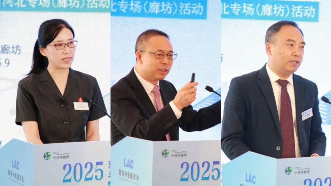 (从左至右依次为:河北省高级人民法院民三庭三级高级法官梁俊丽,君合律师事务所合伙人董箫,中国人民大学涉外法治研究院院长、廊仲第三届委员会副主任杜焕芳)