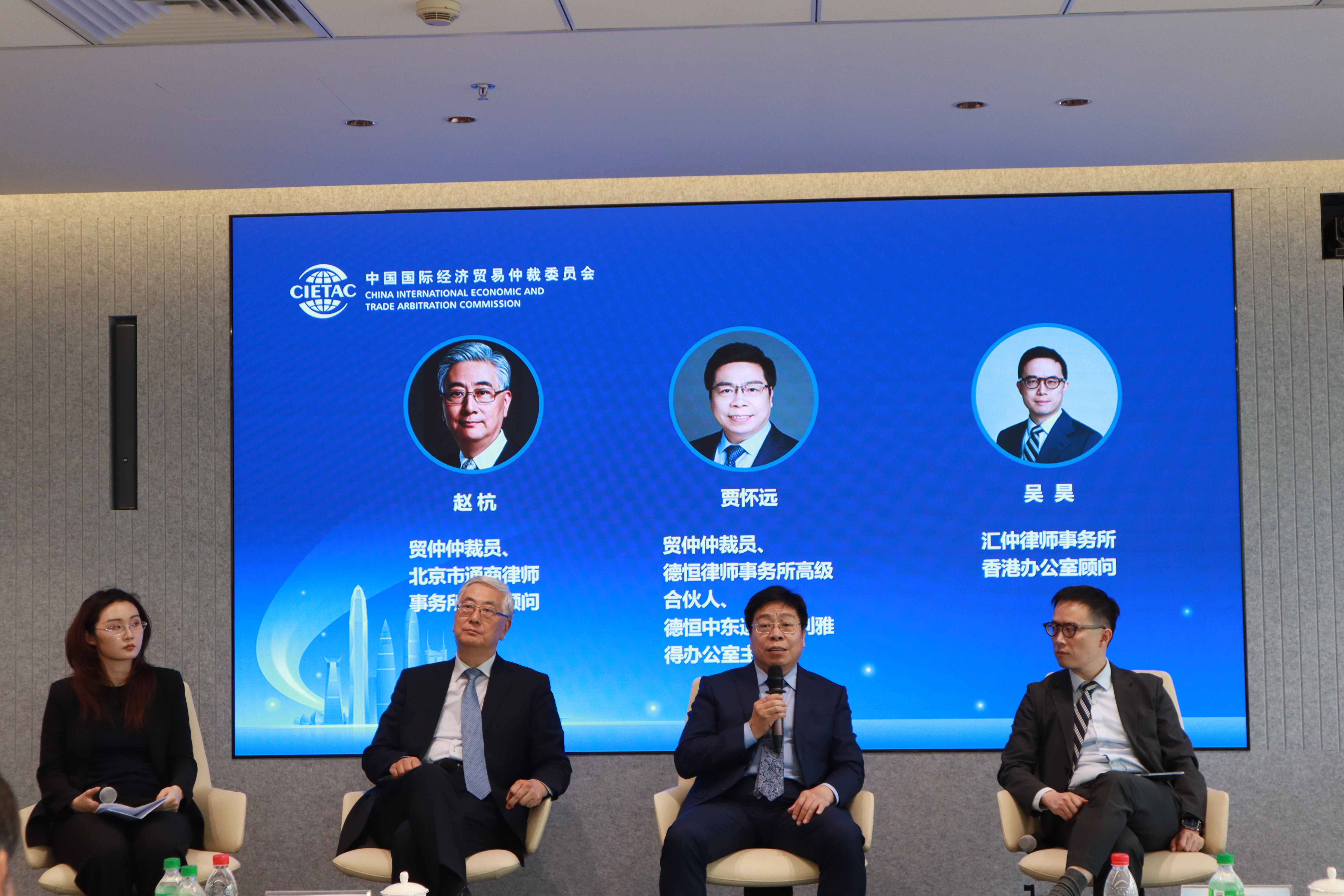 (从左到右依次为:主持人谢唯、赵杭仲裁员、贾怀远仲裁员、吴昊嘉宾)