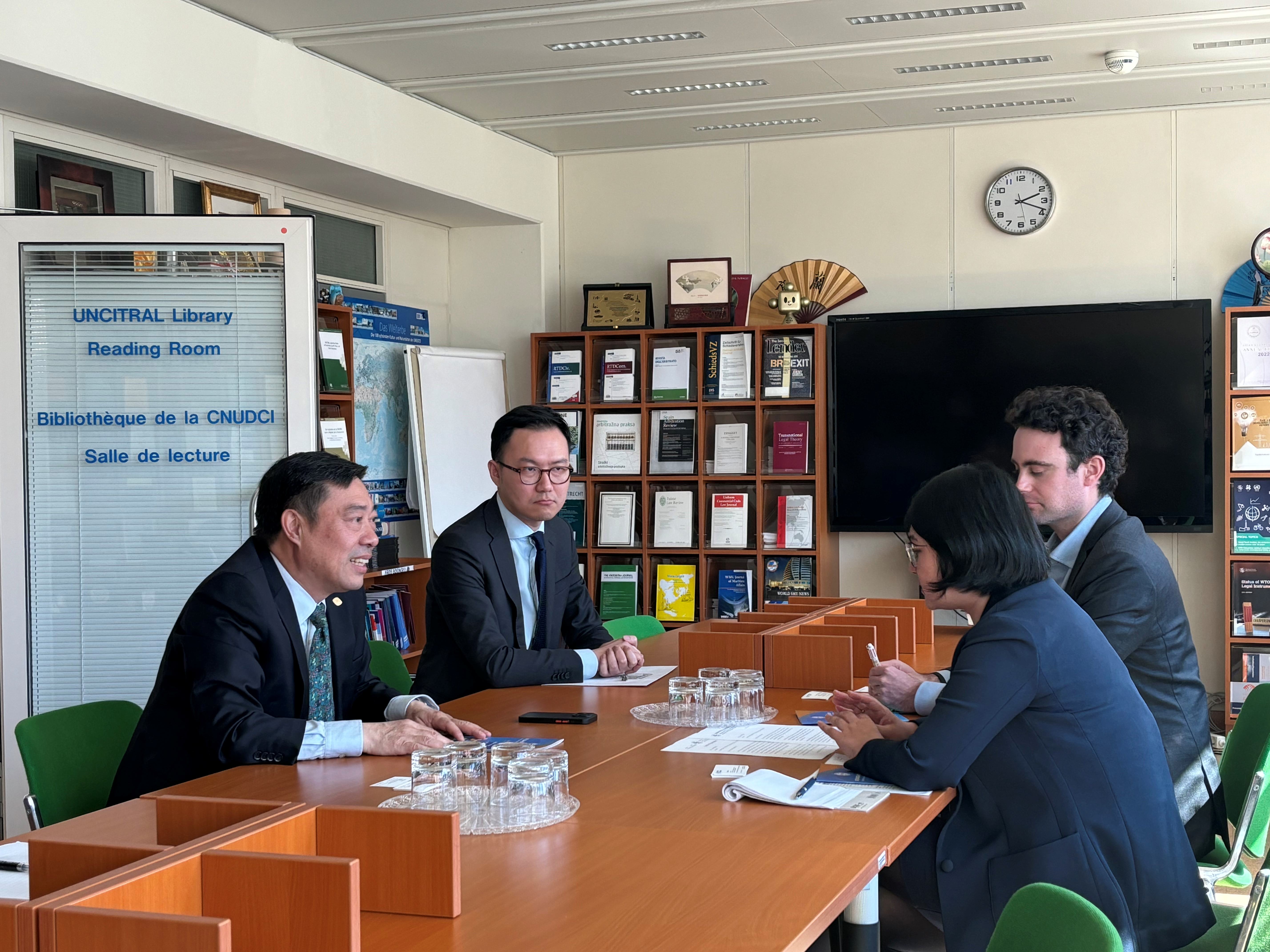 2025年4月28日下午,总代表刘振华会见联合国国际贸易法委员会(United Nations Commission on International Trade Law,UNCITRAL)法律官员李彦莹(Yanying Li)和弗洛朗•盖尔汉•德•梅尔克塞姆(Florent Geelhand De Merxem)。