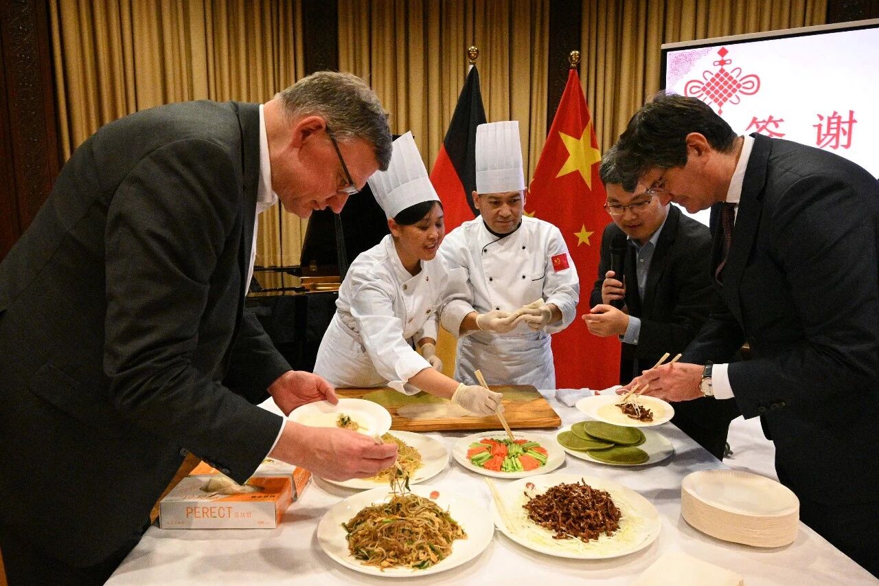 招待会现场气氛温馨友好。来宾们在中国美食与德国热红酒的暖意中共叙友谊、畅谈合作。来自法兰克福广播交响乐团的艺术家演奏了《彩云追月》《茉莉花》《降B大调三重奏》《花之圆舞曲》等中外曲目,赢得阵阵掌声。
