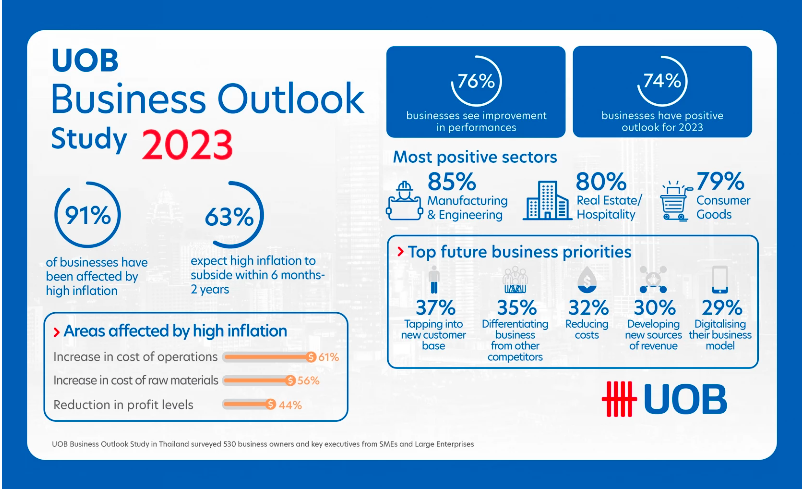 尽管如此,大多数企业预计高通胀将在未来6个月到两年内消退。这一乐观前景与大华银行之前的评估一致,即由于能源价格下降以及全球供应链和分销的改善,泰国通胀似乎已达到顶峰,并自2022年以来逐渐减速。
