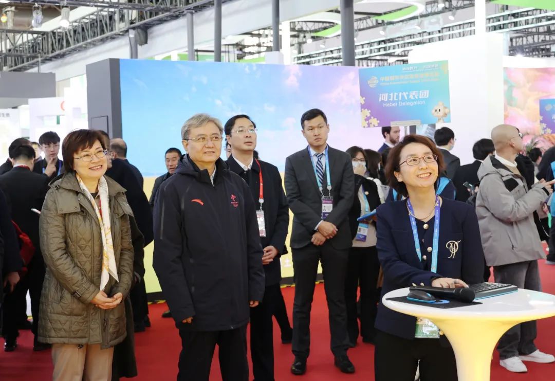 ▲11月28日,河北省副省长金晖(左一),河北省委常委、唐山市委书记武卫东(左二)一行参观正大展馆,正大集团农牧食品企业中国区北京总部市场部品牌总监郭悦杨(右一)热情接待来宾并介绍正大集团全产业链展示屏。