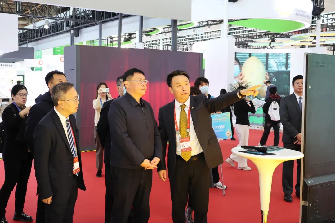 ▲12月2日,北京市国资委党委书记、主任曾劲(左一)一行参观正大展馆,马立煌总监(左二)热情接待来宾并介绍正大终端零售展台。