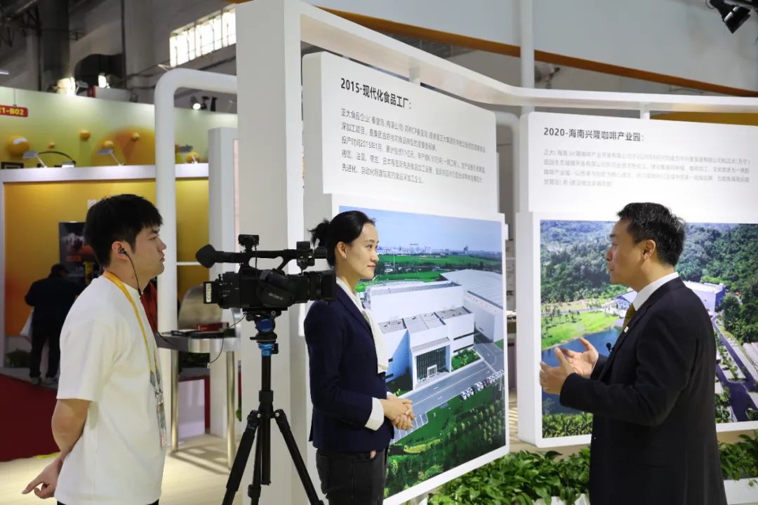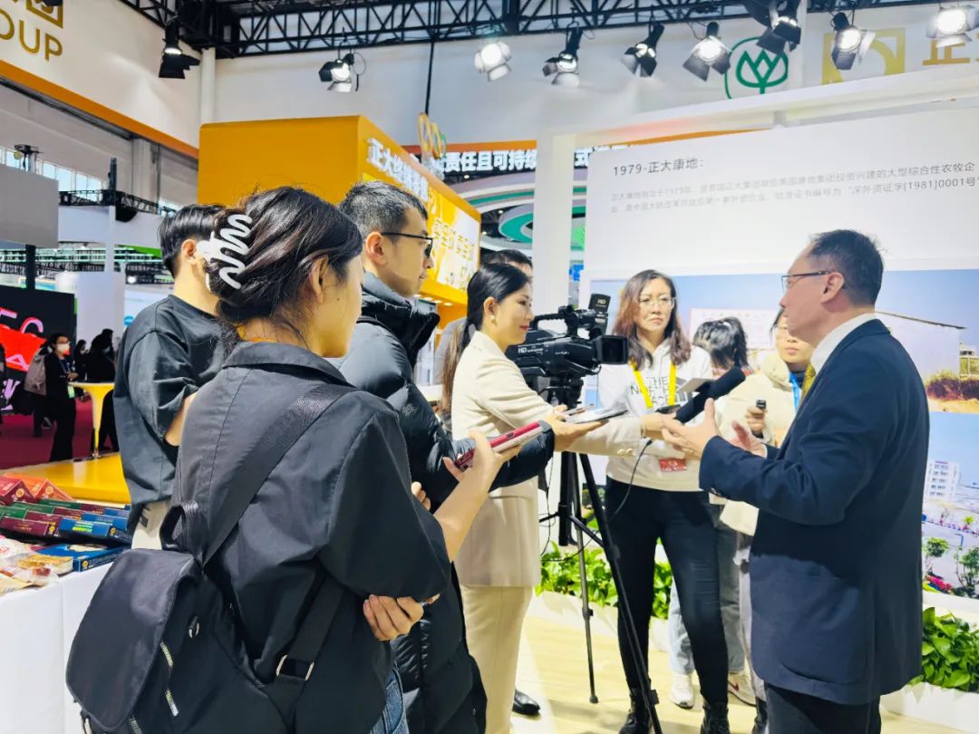 ▲展览期间,张曙晖资深总裁在正大展馆接受中央广播电视总台、新华社、中新社、人民网等媒体记者采访。图为张曙晖资深总裁接受媒体群访。