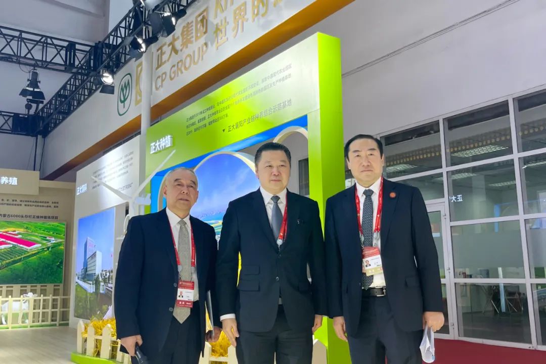 ▲谢吉人集团董事长(中)和张少刚副会长(右)在正大展馆合影留念。薛增一资深副董事长(左)一同合影。