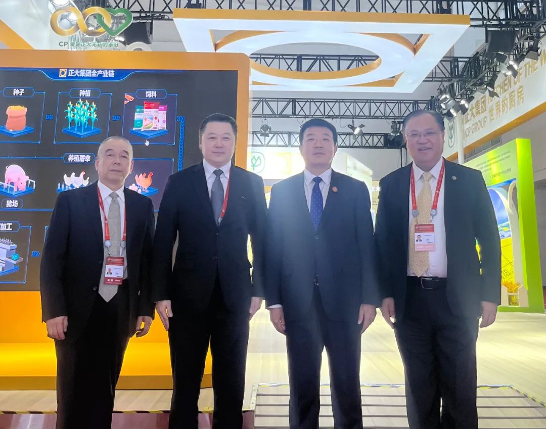 ▲谢国民集团资深董事长(右一)和张少刚副会长(右二)在正大展馆参观交流。